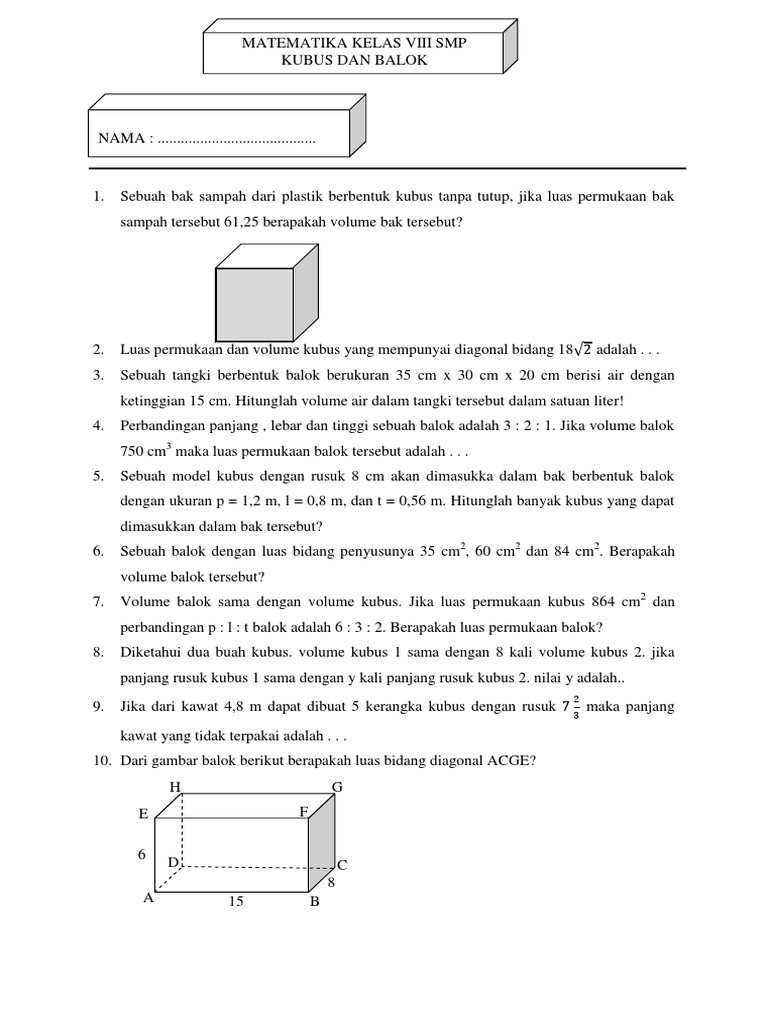 Sebuah akuarium tanpa tutup berukuran panjang 180 cm, leber 120 cm, dan tinggi 80 cm terbuat dari kaca dengan harga rp600.000,00 per meter persegi. Sebuah kotak berbentuk kubus tanpa tutup. Hitunglah luas kubus tanpa tutup jika diketahui panjang rusuknya 6 cm. Diketahui sebuah tabung berdiameter 10 cm dengan tinggi tabung adalah 26 cm. Banyak bidang pada kubus dan balok.