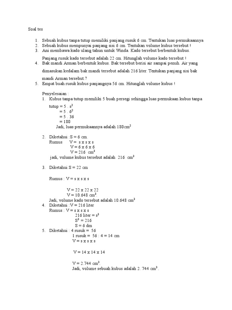 Sebuah akuarium tanpa tutup berukuran panjang 180 cm, leber 120 cm, dan tinggi 80 cm terbuat dari kaca dengan harga rp600.000,00 per meter persegi. Maka, luas permukaannya menjadi 5s² 245 = 5s² 49 = s² 7 = s ada atau tidaknya tutup, tidak mempengaruhi volume, maka bisa digunakan rumus s³ v = s³ = 7³ = 343. Artikel ini membahas mengenai konsep rumus volume dan luas permukaan kubus. Terutama rumus mengenai luas permukaan dan volume yang berlaku pada setiap bangun ruang serta luas permukaan luas permukaan kubus = 6s2. Pahami bahwa luas permukaan kubus terdiri dari luas keenam wajah kubus.